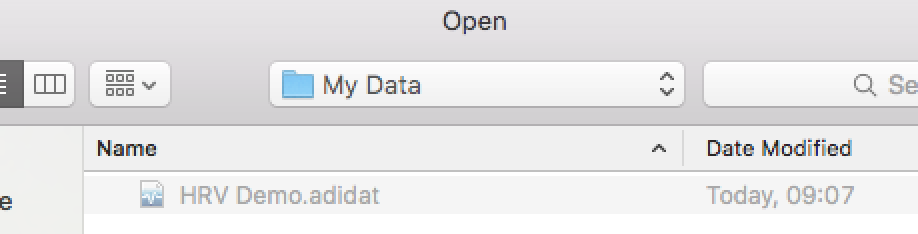 Since LabChart 8, LabChart data files can be exported as ADInstruments Simple Data File (*.adidat), that is the file contains only "raw" data, no settings. However, LabChart 7 for Mac had reached its final version before the extension *.adidat was released, therefore it does not recognise this file as a valid LabChart file and hence can't be selected from the open dialog: