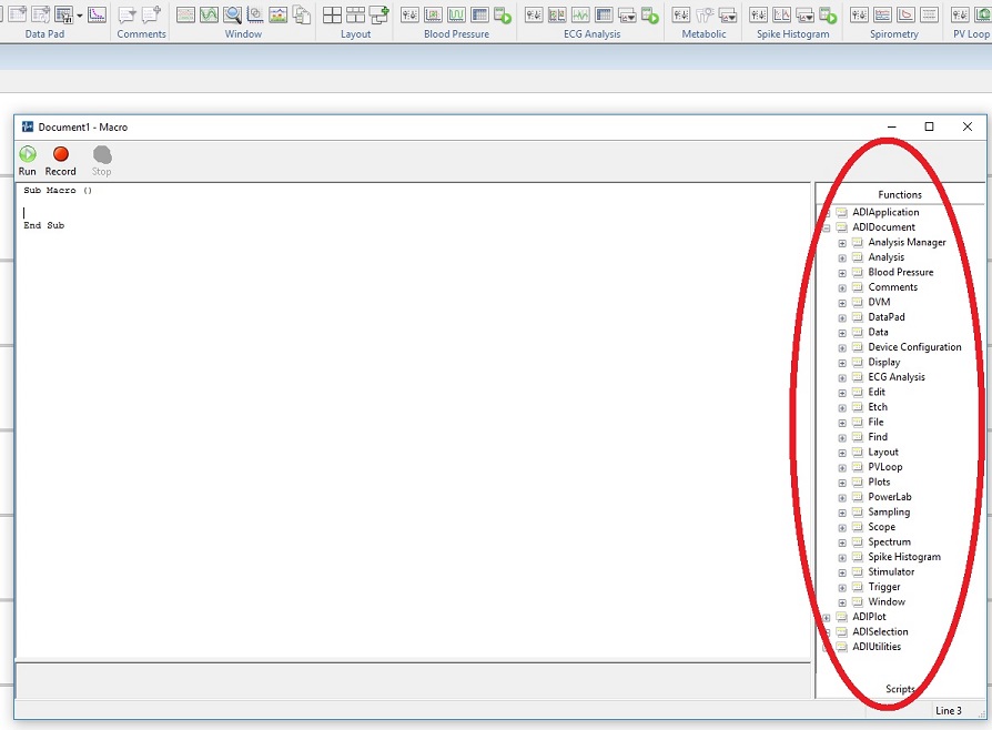 At this time, macro functionality and recording options in the various LabChart analysis modules is limited to a select few functions. For a full list of the available macro commands for a given module, left mouse click on the module's entry in the Macro functions list located on the right side of the Macro Editor Window, as shown in the following image.