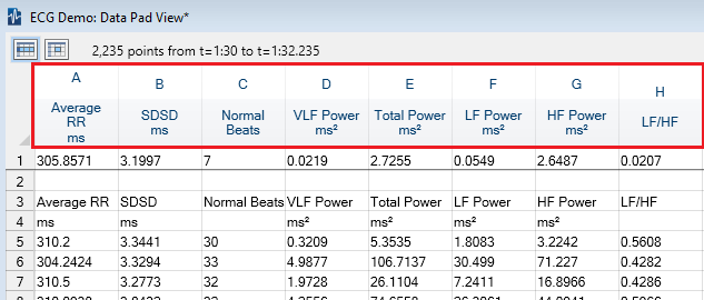 Depending on the version of LabChart and the HRV module you use for your analysis, you may notice some different behavior when trying to add data to Datapad in small time blocks. There are a couple of solutions to ensure that you get the desired values. In either case, you should first set up the required parameters in the Data Pad.