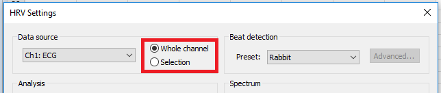 With the latest version of LabChart 8 and HRV v2.0.3, one can analyze the entire channel by choosing the 'whole channel 'option in the HRV settings. You can then use the multiple add to datapad option to add data every 30 seconds. This will then split the analysis into the 30-second bins when applying the results to the datapad. If you have the selection checked in the settings, you should follow the steps for the repetitive task above.