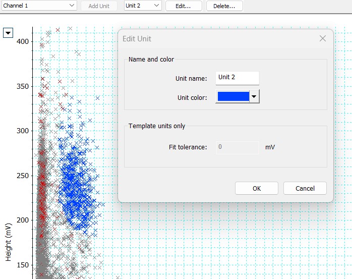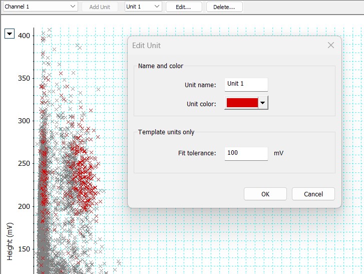 The Fit Tolerance is a feature that is utilized only if you are utilizing the 'Template' method of defining a Unit. A Template is created by clicking a single Spike within the distribution, and selecting 'Add Unit'. This spike acts as a central reference, and all other spikes that fall within the set fit tolerance of the reference spike will also be included in the unit: