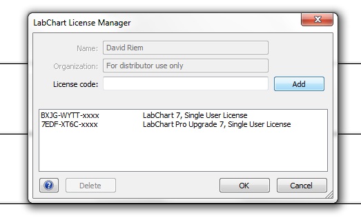 The basic Chart/LabChart license code needs to be entered in addition to the Chart/LabChart Pro upgrade license code (as pictured below) in order to use the LabChart software.