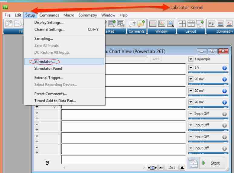 Connect a 15T or 26T teaching series PowerLab to your computer and turn it on. Open the experiment in the LabAuthor program, and take a look at the Stimulator Settings in LabTutor Kernel View.