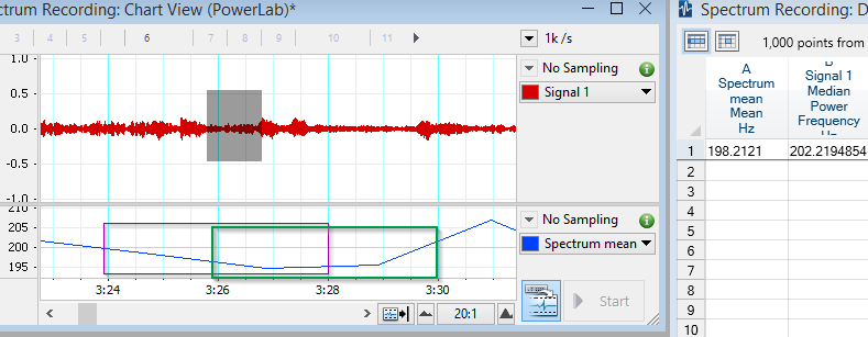 In contrast, the Data Pad spectrum calculation starts its analysis at the first point in the selection made. As an example, for a selection started at 3:26 as shown above, the data point at 3:26 would be the first data point in the FFT analysis block analyzed in the Data Pad spectral analysis. However, for the Spectral analysis performed in channel 2, the value at 3:26 includes some of an FFT analysis block that began at 3:24. These data points would not be a part of the Data Pad analysis because they precede the selection.